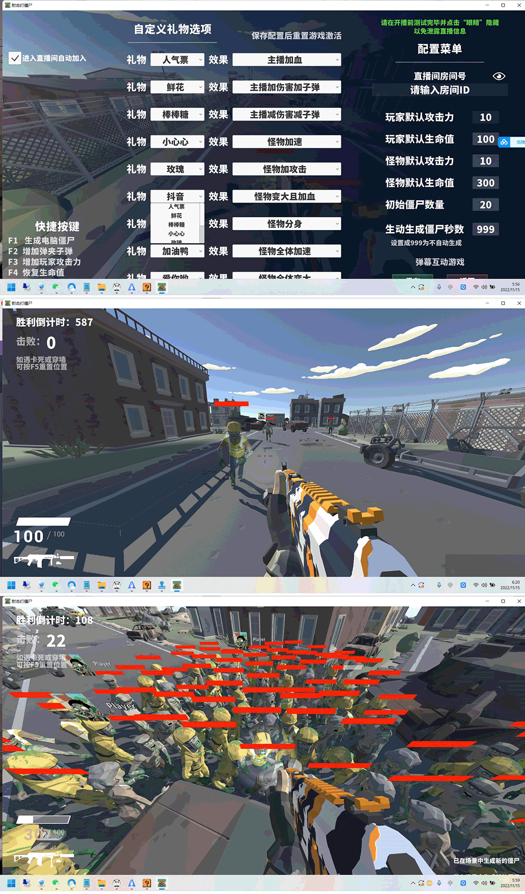 游戏主要是主播做为第一人称的人类,用户进入直播间就会会自动加入战斗来打主播,观看直播的观众可以打赏主播帮助主播去打僵尸,比较以前的三体等游戏,这个打僵尸直播游戏个人感觉互动体验感还是比较高的。